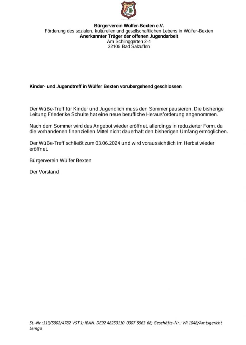 Der Jugend-FreiZeitRaum Wülfer-Bexten ist eine Einrichtung, die vom Heimatverein betrieben wird. Der Jugend-FreiZeitRaum ist ein Ort, an dem Jugendliche zwischen 6 und 16 jahren aus Wülfer Bexten und der Umgebung zusammenkommen können, um ihre Freizeit zu gestalten und sich mit Gleichaltrigen auszutauschen.